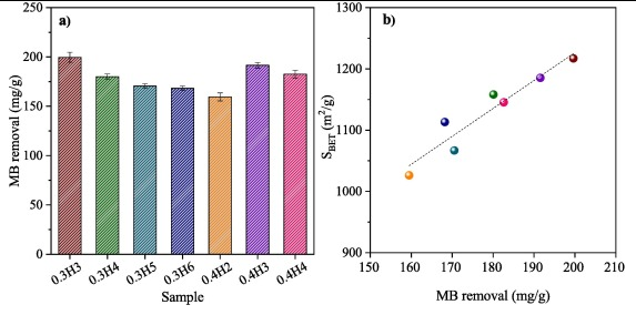 Figure 4: Comparison of MB removal from water using all ACs prepared in this study (a) and correlation with surface area (b)